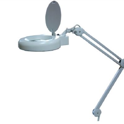 夾桌邊放大鏡 規格說明: .鏡片材料:光學玻璃 .鏡片倍率:5倍光學放大鏡 .屈光度 :3屈光度 5屈光度 .電壓:110V-120V .光源:T9 22W的環形螢光燈管配用電子鎮流器 .顏色:白 .標準底座:桌邊夾